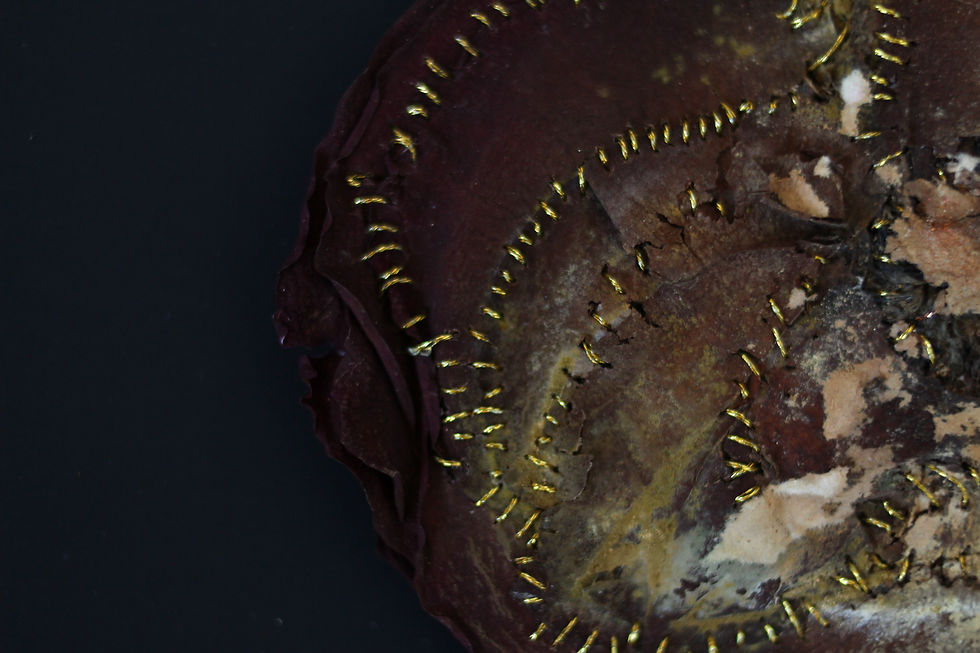 Fleur séchée, empreinte de fleur, moisissures, fils d'or et de cuivre, encre dorée et cuivre.